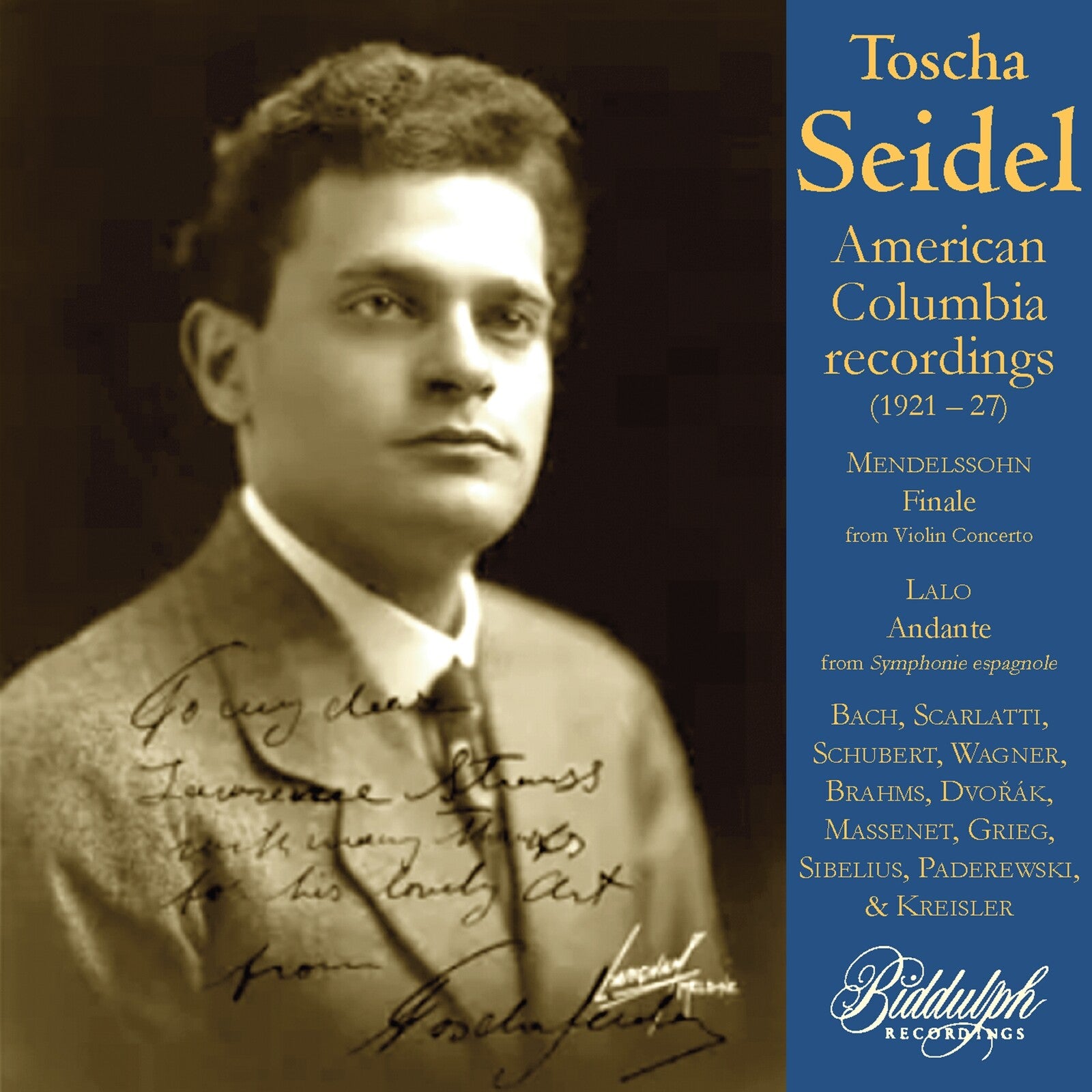 Dubbed 'the devil' by his teacher Leopold Auer (alongside Jascha Heifetz whom he called 'the angel'), Toscha Seidel (1899-1962) was regarded by Carl Flesch as 'the third in a triumvirate' of Auer's greatest pupils, along with Heifetz and Mischa Elman. This CD continues Biddulph Recordings' traversal of Seidel's recordings made for the American Columbia label, covering the peri-od between 1921-1927. Among the pieces included are such well-known favourites as the 'Meditation' from Massenet's opera Thais, Paderewski's Minuet in G, Dvorak's Humoresque and Brahms Hungarian Dance No.1. Several original works by Fritz Kreisler, as well as August Wilhelmj's beloved arrangements of Bach's Air on the G-string and Wagner's Albumblatt. In addition to imaginative transcriptions of orchestral selections from Grieg's Peer Gynt, Sibelius's Kuolema and Rimsky-Korsakov's Scheherazade, there are rarities by Fibich, Domenico Scarlatti, and the American-born violinist Cecil Burleigh. This CD also features Seidel playing violin obligato in Schubert's Serenade from Schwanengesang with the American-born lyric tenor Charles Hackett and two concerto movements accompanied by a studio orchestra: a sparkling rendition of the Finale from Mendelssohn's beloved Concerto in E minor and the poignant Andante from Edouard Lalo's Symphonie espagnole.
