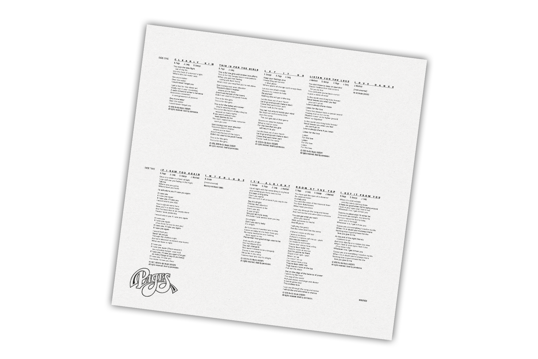 The album Pages is a blend of pop, rock, and jazz influences, showcasing the duo's knack for crafting catchy melodies and intricate harmonies. Richard Page's distinct vocal style, combined with Steve George's keyboard wizardry, set a foundation for the lush and polished sound that would define their future work. Next to the further band members Peter Leinheiser, Jerry Manfredi and Russ Battelene, session musicians included Philip Bailey (Earth, Wind &; Fire), Dave Grusin and Michael Brecker. Notable tracks include "If I Saw You Again" and "Let It Go".