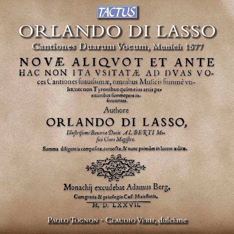 This is the world premiere recording of Orlando di Lasso's Cantiones duarum vocum. Published in Munich in 1577, it includes 24 pieces for two voices or instruments without basso continuo. It is performed here on two dulcians (renaissance bassoons) by Paolo Tognon and Claudio Verh.