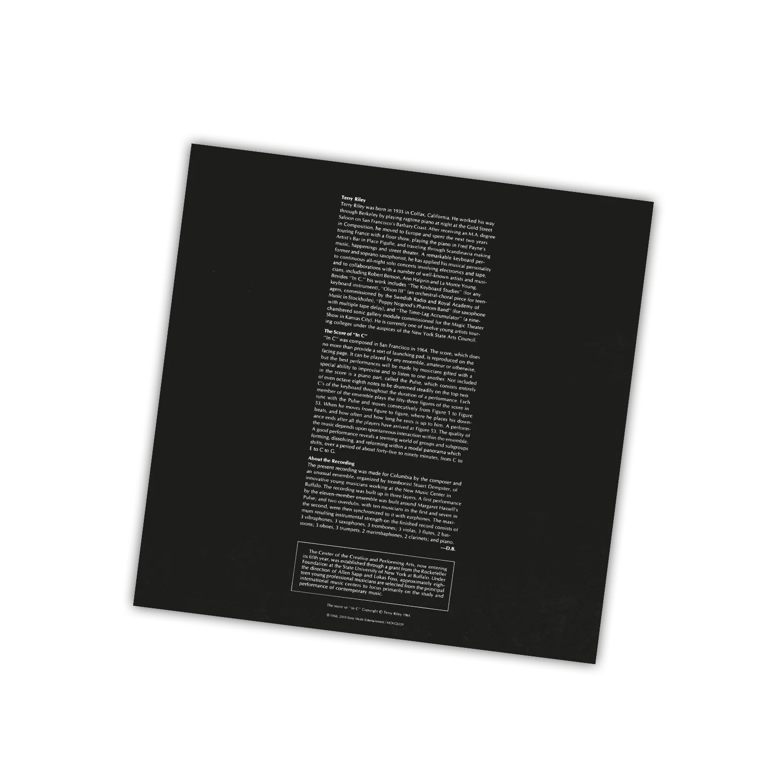 ‘In C’ was first released on record in 1968, the result of a recording session with musicians from the Centre Of Creative And Performing Arts at Buffalo University, New York. Upon its release, the album caused a sensation in the world of modern music and is now regarded as a major triumph of 20th Century composition.